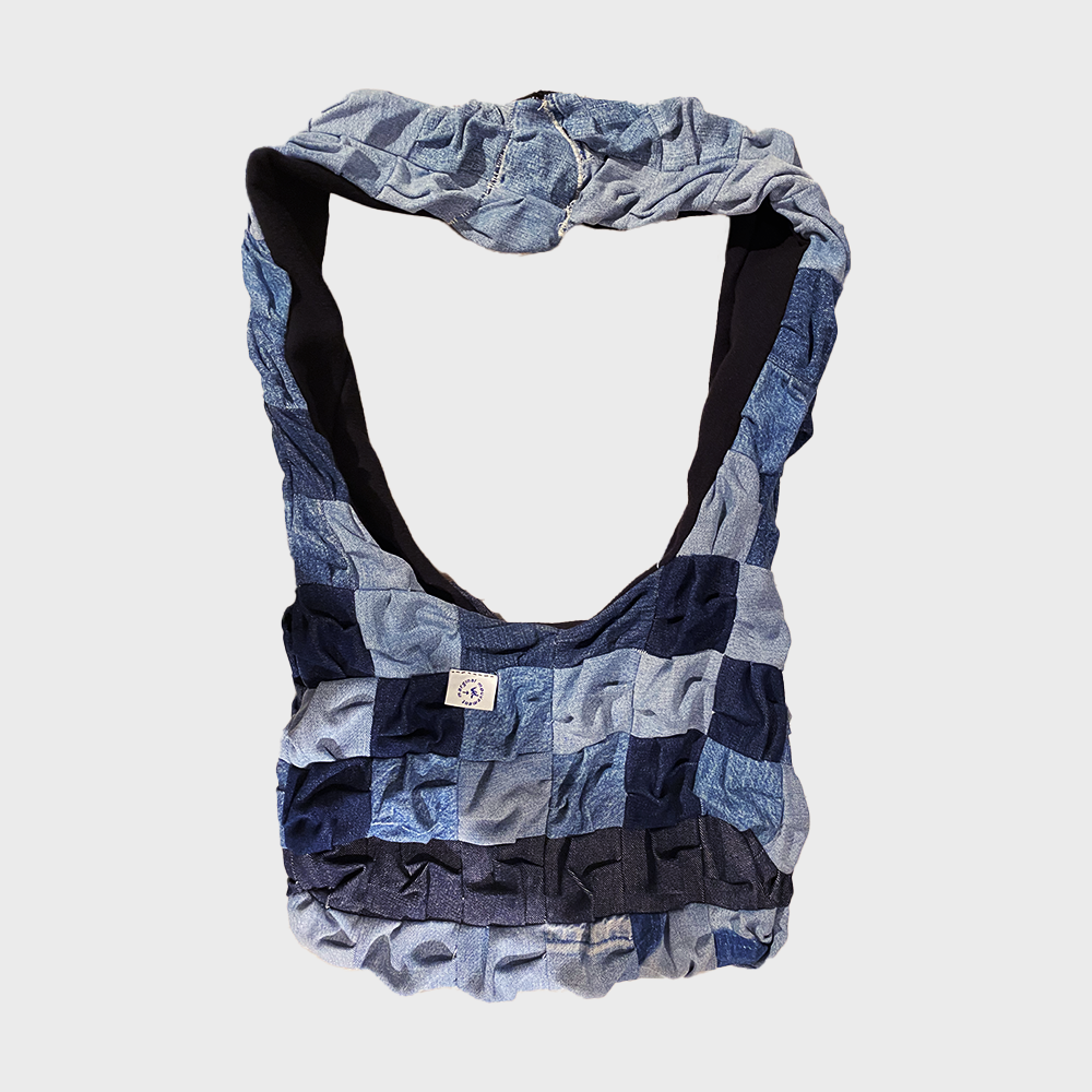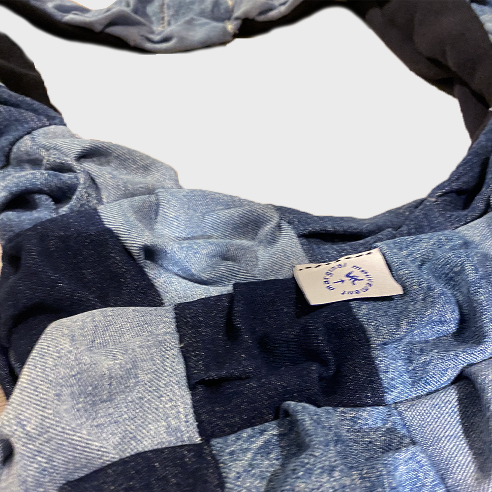 Ce sac unique est le fruit d’une collaboration avec Setsuna, une artiste lyonnaise au talent remarquable. Fait à la main, il se compose de carrés de jean soigneusement cousus entre eux, créant un motif patchwork de puzzle.